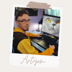 Artyom ist ein begabter Künstler, dessen Leidenschaft für die bildenden Künste schon früh in seinem Leben entflammt ist. Von den unbeholfenen Zeichnungen in Skizzenbüchern und Notizbüchern als Kind, über das Studium an der Kunstschule bis hin zum Kunstinstitut, hat Artyom sein Können stetig weiterentwickelt. Artyom ist ein Mann mit vielseitigen Interessen, er begeistert sich sowohl für die klassische Malerei als auch für ihr digitales Gegenstück. Nicht nur Kunst, sondern auch Tiere haben es Artyom angetan. Als Haustiere hat er zwei Sphynx-Ratten, die ihm immer Gesellschaft leisten.